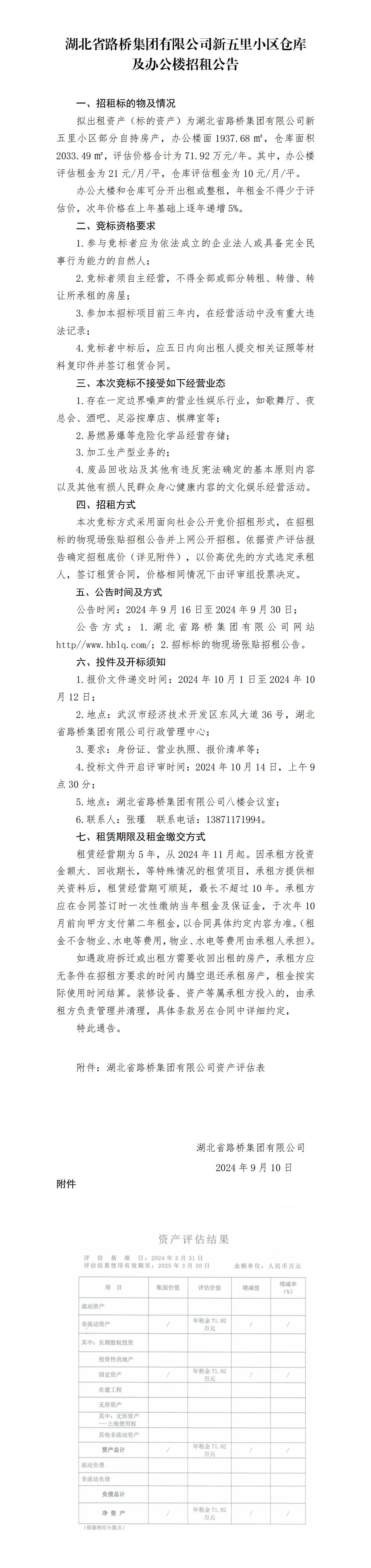 湖北省路橋集團(tuán)有限公司新五里小區(qū)倉庫及辦公樓招租公告